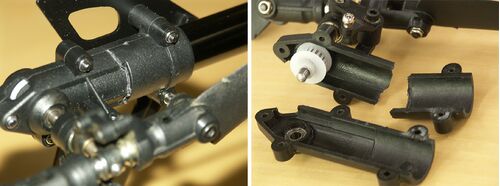 . ベルトの緩みが解消したので、土曜日に公園でのフライトを予定していました。 その前に屋内で調整しようと浮かせていると、お尻が小刻みにビクビクと・・・。 降ろして調べると、ナント、テールギアケースが割れています。 先日のテストで、30cm位の高さ…